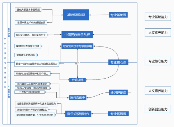 前期通过基础乐理知识、视唱练耳的教学,使员工掌握乐理基础知识及独立识谱的能力,在此基础上开设核心声乐课程——歌唱发声技术与歌曲演唱。在歌曲演唱的学习中,从体验到实践,培养员工独立学习歌曲、演唱流行歌曲(艺术歌曲)的能力。合唱课的开设为员工提供了合唱学习实践平台,在掌握一定歌唱技巧的同时,通过合唱课程锻炼员工歌唱表演能力,同时也培养其合作意识,满足新时代社会各行业对具有合唱排练能力的综合性人才的需求。为拓宽员工的艺术视野、丰富音乐文化知识,开设了中国民族音乐赏析和流行音乐史。在员工具备了基础知识和演唱、综合表演能力基础上,开设音乐短视频创作,使员工能够将表演的音乐片段制作成短视频,充分体现艺术与科技相结合的新文科艺术培养特点。