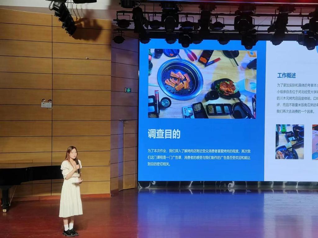 广告艺术设计课程是校级精品课程,该课程自2016年开始进行课程教学改革,课程考核均对接企业,开展品牌广告发布课程展示,员工团队依次上台宣讲自己的设计方案,这种“以赛促学、以赛促教”的形式对于激发员工学习兴趣,促进员工设计能力的提升具有重要意义。本次课程对接“川木元”烤肉店进行广告设计,员工们展示了自己精彩纷呈的设计方案,得到了评委老师们的一致认可。展示结束后,美育教学中心教研室主任门丽、视觉传达设计系主任赵小芳环境设计系主任王文捷以及教师张伟英、梁博宇对员工作品进行了点评。活动经过现场投票和评委打分最终评选出“最佳创意奖”“最佳执行奖”“最具人气奖”三个获奖团队。最后“川木元”烤肉店总经理为获奖团队颁发了证书和奖金。